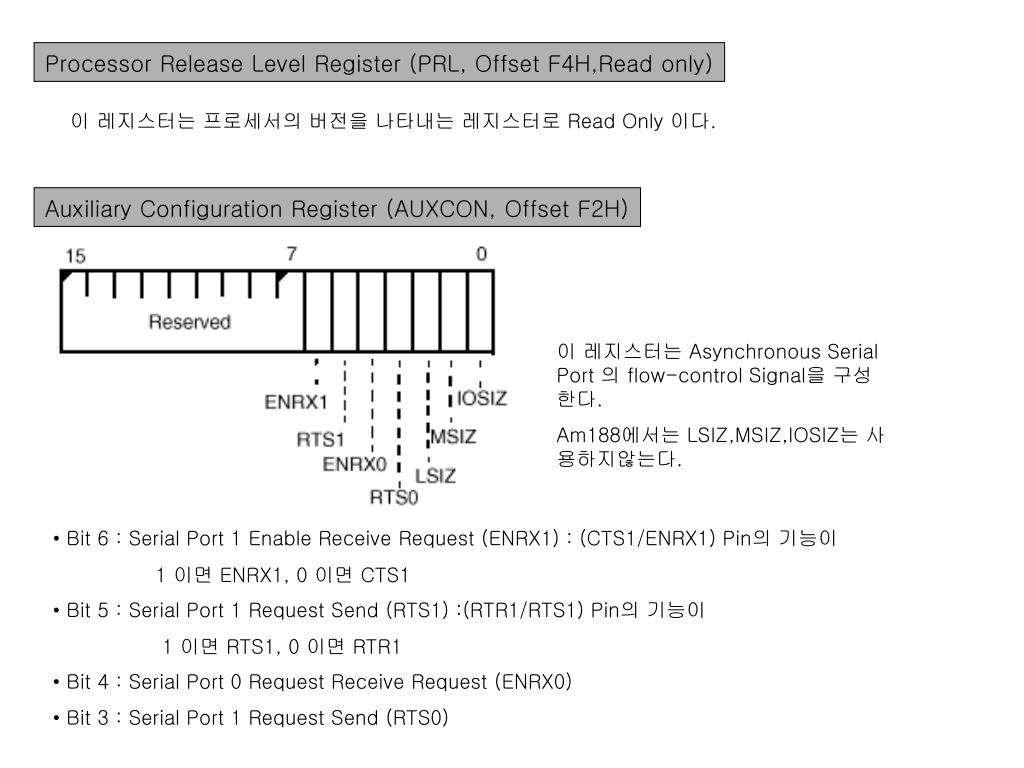 Processor Release Level Register (PRL, Offset F4H,Read only) 이 레지스터는 프로세서의 버전을 나타내는 레지스터로 Read Only 이다. Auxiliary Configuration Register (AUXCON, Offset F2H) 이 레지스터는 Asynchronous Serial Port 의 flow-control Signal을 구성한다. Am188에서는 LSIZ,MSIZ,IOSIZ는 사용하지않는다. • Bit 6 : Serial Port 1 Enable Receive Request (ENRX1) : (CTS1/ENRX1) Pin의 기능이 1 이면 ENRX1, 0 이면 CTS1 • Bit 5 : Serial Port 1 Request Send (RTS1) :(RTR1/RTS1) Pin의 기능이 1 이면 RTS1, 0 이면 RTR1 • Bit 4 : Serial Port 0 Request Receive Request (ENRX0) • Bit 3 : Serial Port 1 Request Send (RTS0)