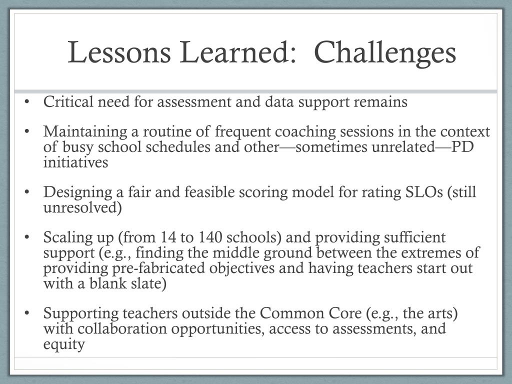Lessons Learned: Challenges • Critical need for assessment and data support remains • Maintaining a routine of frequent coaching sessions in the context of busy school schedules and other—sometimes unrelated—PD initiatives • Designing a fair and feasible scoring model for rating SLOs (still unresolved) • Scaling up (from 14 to 140 schools) and providing sufficient support (e.g., finding the middle ground between the extremes of providing pre-fabricated objectives and having teachers start out with a blank slate) • Supporting teachers outside the Common Core (e.g., the arts) with collaboration opportunities, access to assessments, and equity