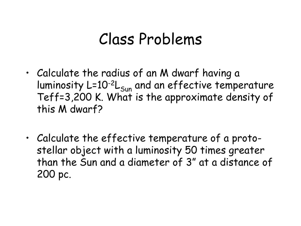 Class Problems • Calculate the radius of an M dwarf having a luminosity L=10-2LSun and an effective temperature Teff=3,200 K. What is the approximate density of this M dwarf? • Calculate the effective temperature of a proto-stellar object with a luminosity 50 times greater than the Sun and a diameter of 3” at a distance of 200 pc.