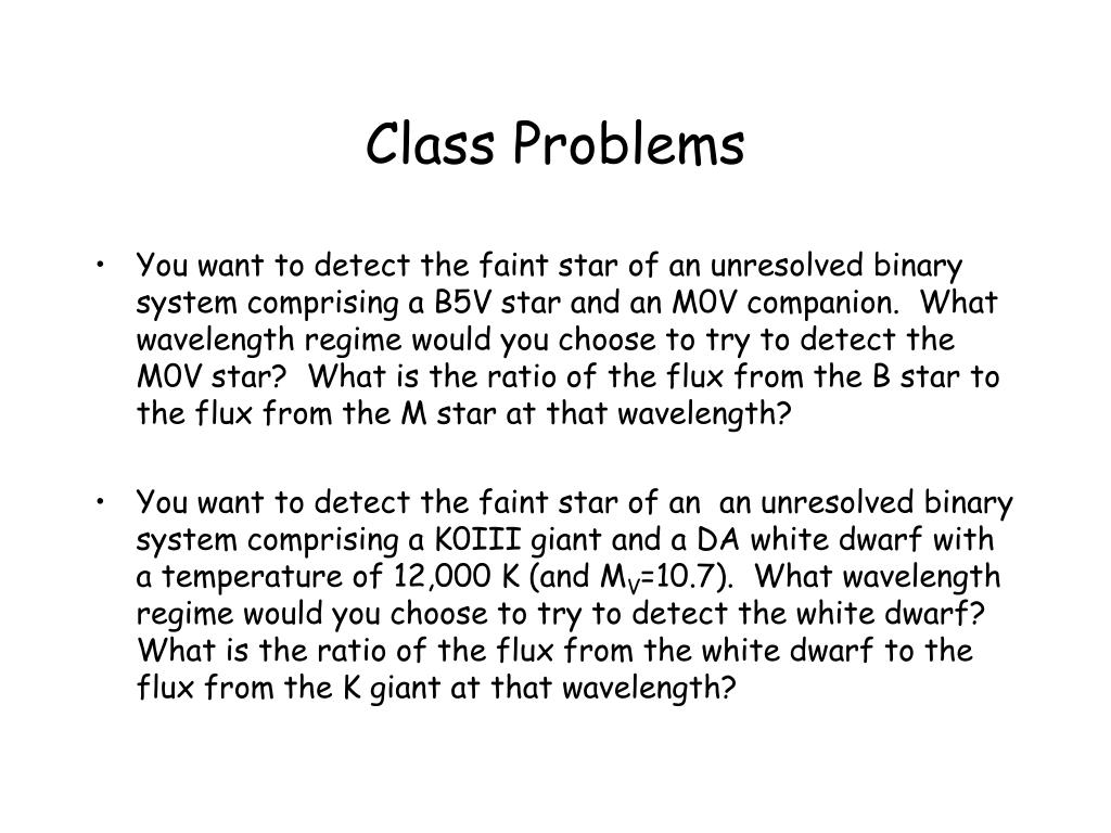 Class Problems • You want to detect the faint star of an unresolved binary system comprising a B5V star and an M0V companion. What wavelength regime would you choose to try to detect the M0V star? What is the ratio of the flux from the B star to the flux from the M star at that wavelength? • You want to detect the faint star of an an unresolved binary system comprising a K0III giant and a DA white dwarf with a temperature of 12,000 K (and MV=10.7). What wavelength regime would you choose to try to detect the white dwarf? What is the ratio of the flux from the white dwarf to the flux from the K giant at that wavelength?