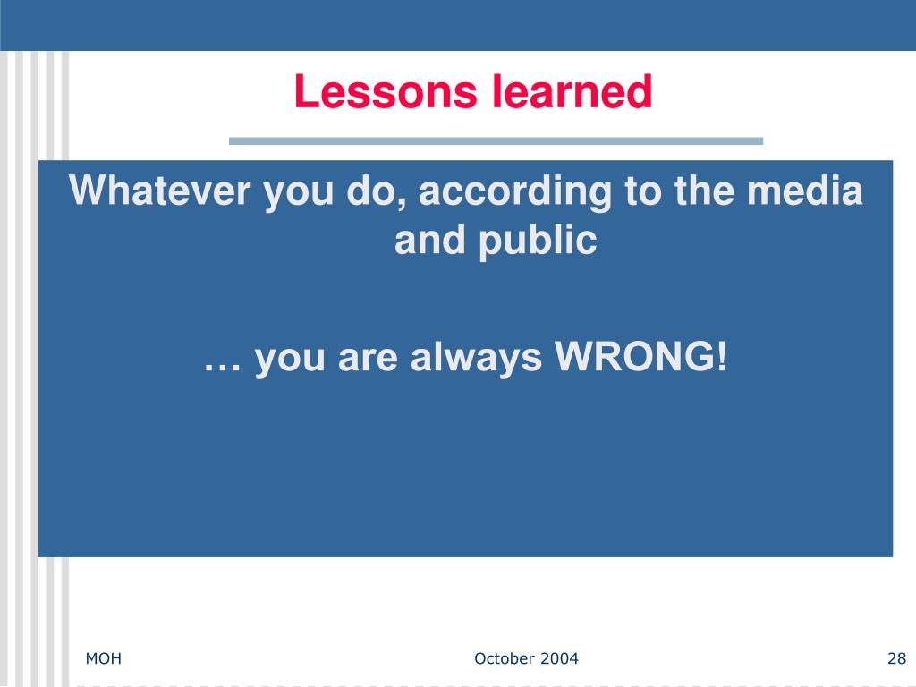 Lessons learned Whatever you do, according to the media and public … you are always WRONG! MOH