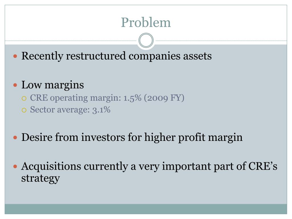 Problem • Recently restructured companies assets • Low margins • CRE operating margin: 1.5% (2009 FY) • Sector average: 3.1% • Desire from investors for higher profit margin • Acquisitions currently a very important part of CRE’s strategy