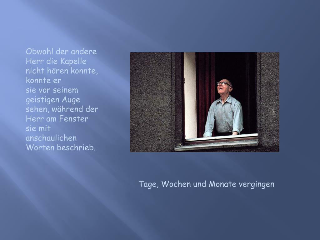 Obwohl der andere Herr die Kapelle nicht hören konnte, konnte er sie vor seinem geistigen Auge sehen, während der Herr am Fenster sie mit anschaulichen Worten beschrieb. Tage, Wochen und Monate vergingen