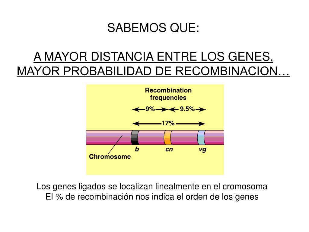 SABEMOS QUE: A MAYOR DISTANCIA ENTRE LOS GENES, MAYOR PROBABILIDAD DE RECOMBINACION… Los genes ligados se localizan linealmente en el cromosoma El % de recombinación nos indica el orden de los genes