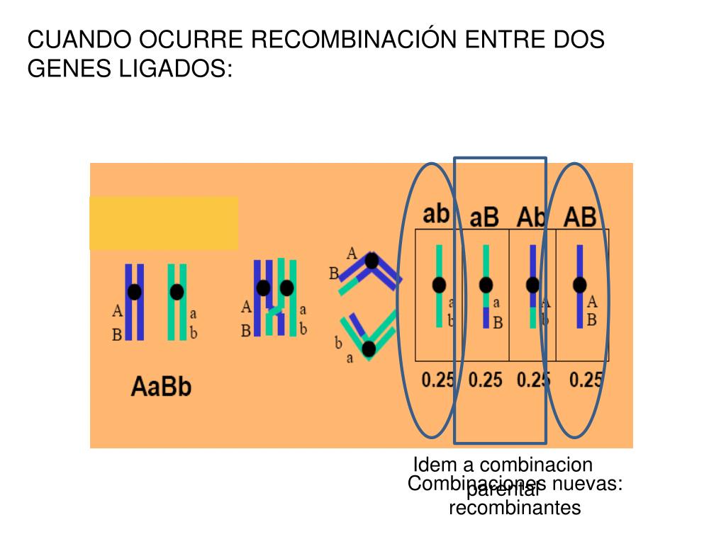 CUANDO OCURRE RECOMBINACIÓN ENTRE DOS GENES LIGADOS: Idem a combinacion parental Combinaciones nuevas: recombinantes