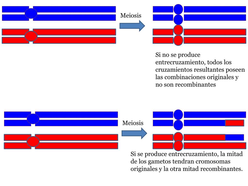 Meiosis Si no se produce entrecruzamiento, todos los cruzamientos resultantes poseen las combinaciones originales y no son recombinantes Meiosis Si se produce entrecruzamiento, la mitad de los gametos tendran cromosomas originales y la otra mitad recombinantes.