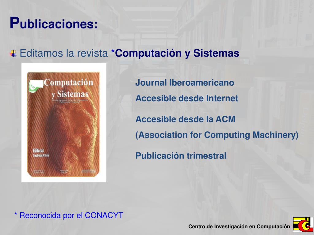 Publicaciones: • Editamos la revista *Computación y Sistemas Journal Iberoamericano Accesible desde InternetAccesible desde la ACM (Association for Computing Machinery) Publicación trimestral * Reconocida por el CONACYT
