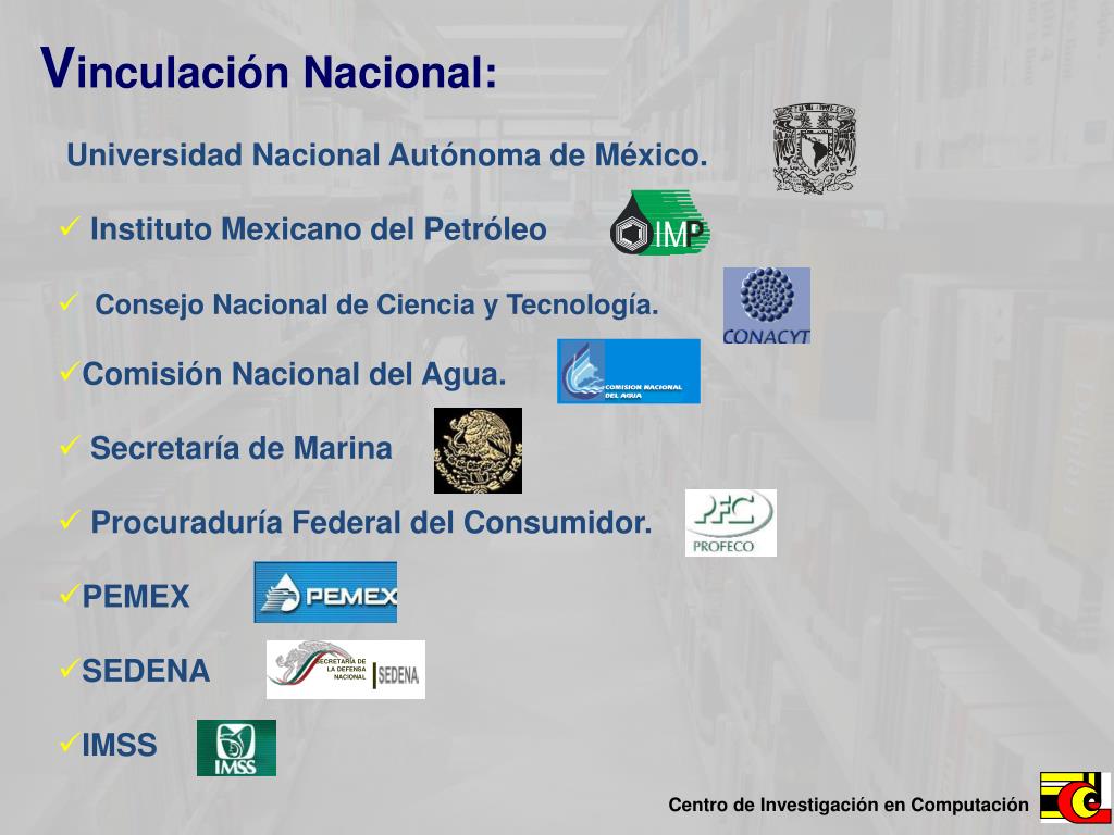 SECRETARÍA DE LA DEFENSA NACIONAL Vinculación Nacional: • Universidad Nacional Autónoma de México. • Instituto Mexicano del Petróleo • Consejo Nacional de Ciencia y Tecnología. • Comisión Nacional del Agua. • Secretaría de Marina • Procuraduría Federal del Consumidor. • PEMEX • SEDENA • IMSS