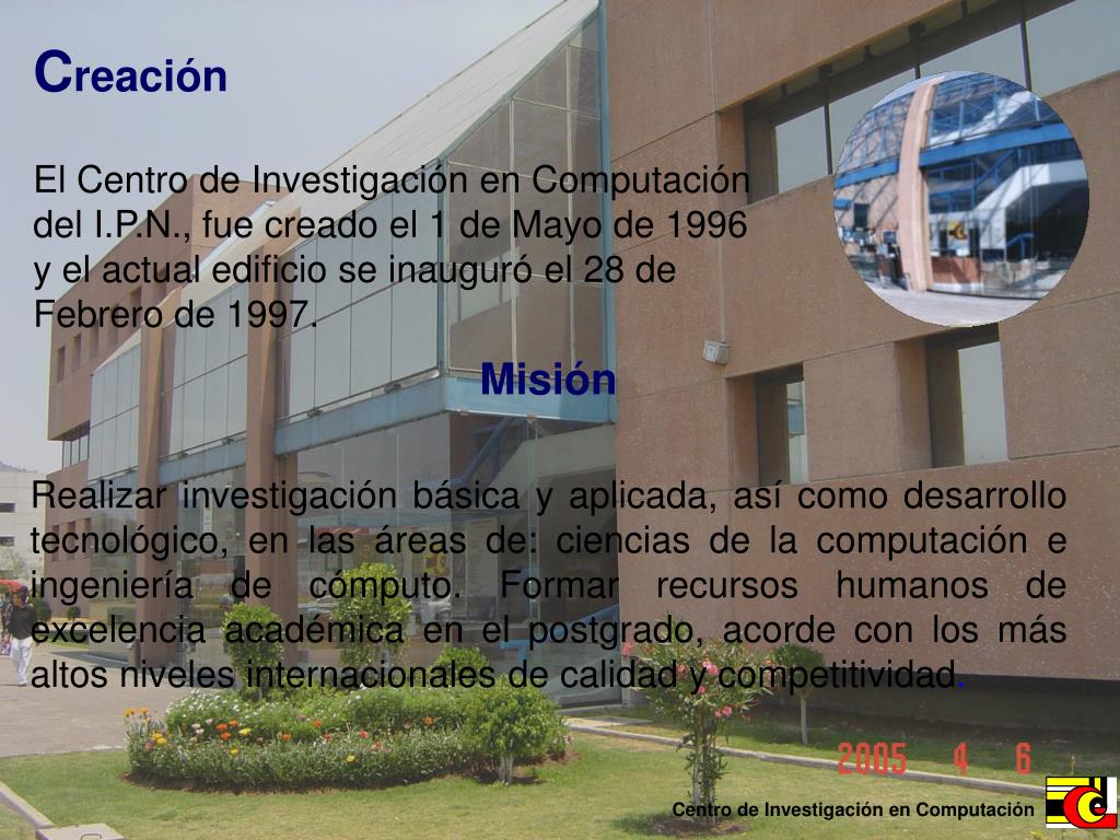 CreaciónEl Centro de Investigación en Computación del I.P.N., fue creado el 1 de Mayo de 1996y el actual edificio se inauguró el 28 deFebrero de 1997. MisiónRealizar investigación básica y aplicada, así como desarrollo tecnológico, en las áreas de: ciencias de la computación e ingeniería de cómputo. Formar recursos humanos de excelencia académica en el postgrado, acorde con los más altos niveles internacionales de calidad y competitividad.