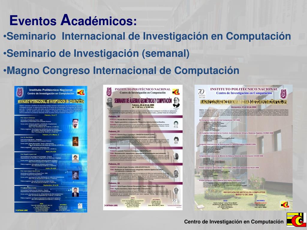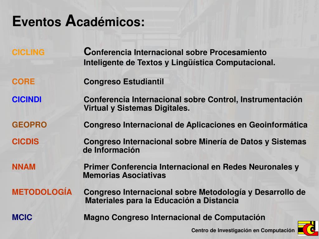 Eventos Académicos: CICLING Conferencia Internacional sobre Procesamiento Inteligente de Textos y Lingüística Computacional.CORECongreso Estudiantil CICINDIConferencia Internacional sobre Control, Instrumentación Virtual y Sistemas Digitales. GEOPROCongreso Internacional de Aplicaciones en Geoinformática CICDIS Congreso Internacional sobre Minería de Datos y Sistemas de Información NNAM Primer Conferencia Internacional en Redes Neuronales y Memorias Asociativas METODOLOGÍACongreso Internacional sobre Metodología y Desarrollo de Materiales para la Educación a Distancia MCICMagno Congreso Internacional de Computación