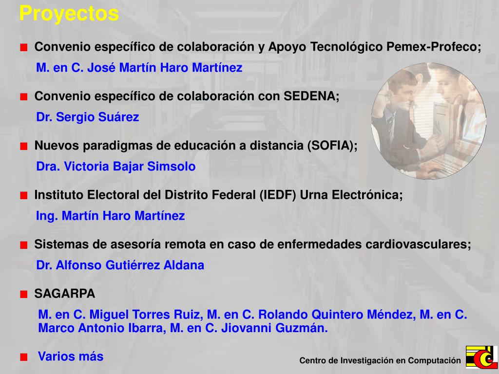 Proyectos • Convenio específico de colaboración y Apoyo Tecnológico Pemex-Profeco; • M. en C. José Martín Haro Martínez • Convenio específico de colaboración con SEDENA; • Dr. Sergio Suárez • Nuevos paradigmas de educación a distancia (SOFIA); • Dra. Victoria Bajar Simsolo • Instituto Electoral del Distrito Federal (IEDF) Urna Electrónica; • Ing. Martín Haro Martínez • Sistemas de asesoría remota en caso de enfermedades cardiovasculares; • Dr. Alfonso Gutiérrez Aldana • SAGARPA • M. en C. Miguel Torres Ruiz, M. en C. Rolando Quintero Méndez, M. en C. Marco Antonio Ibarra, M. en C. Jiovanni Guzmán. • Varios más