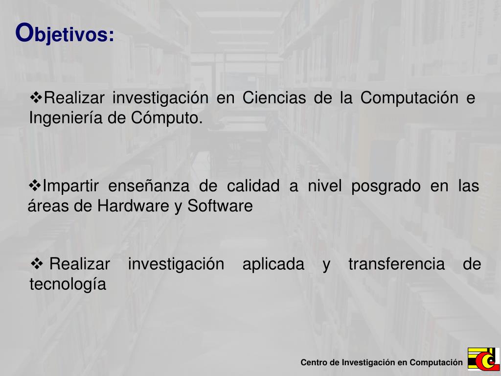 Objetivos: • Realizar investigación en Ciencias de la Computación e Ingeniería de Cómputo. • Impartir enseñanza de calidad a nivel posgrado en las áreas de Hardware y Software • Realizar investigación aplicada y transferencia de tecnología