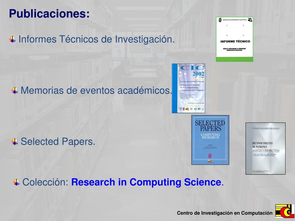 Publicaciones: • Informes Técnicos de Investigación. • Memorias de eventos académicos. • Selected Papers. • Colección: Research in Computing Science.