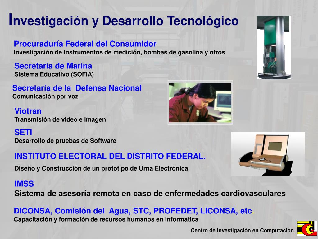 Investigación y Desarrollo Tecnológico Procuraduría Federal del Consumidor Investigación de Instrumentos de medición, bombas de gasolina y otros Secretaría de Marina Sistema Educativo (SOFIA) Secretaría de la Defensa Nacional Comunicación por voz Viotran Transmisión de video e imagen SETI Desarrollo de pruebas de Software INSTITUTO ELECTORAL DEL DISTRITO FEDERAL. Diseño y Construcción de un prototipo de Urna Electrónica IMSS Sistema de asesoría remota en caso de enfermedades cardiovasculares DICONSA, Comisión del Agua, STC, PROFEDET, LICONSA, etc. Capacitación y formación de recursos humanos en informática