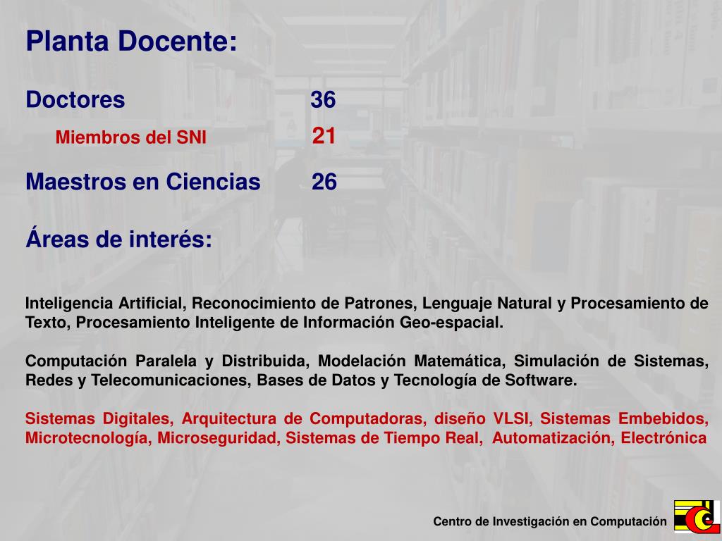 Planta Docente: Doctores36 Miembros del SNI 21 Maestros en Ciencias 26 Áreas de interés: Inteligencia Artificial, Reconocimiento de Patrones, Lenguaje Natural y Procesamiento de Texto, Procesamiento Inteligente de Información Geo-espacial. Computación Paralela y Distribuida, Modelación Matemática, Simulación de Sistemas, Redes y Telecomunicaciones, Bases de Datos y Tecnología de Software. Sistemas Digitales, Arquitectura de Computadoras, diseño VLSI, Sistemas Embebidos, Microtecnología, Microseguridad, Sistemas de Tiempo Real, Automatización, Electrónica