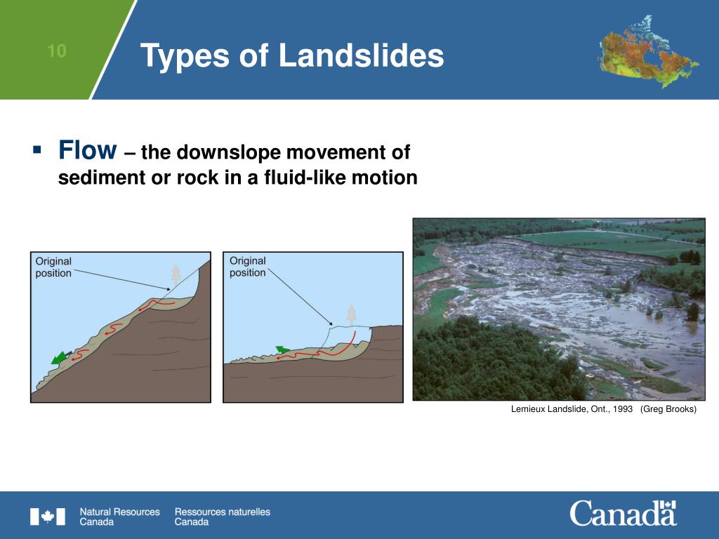 Types of Landslides • Flow– the downslope movement of sediment or rock in a fluid-like motion Lemieux Landslide, Ont., 1993 (Greg Brooks)
