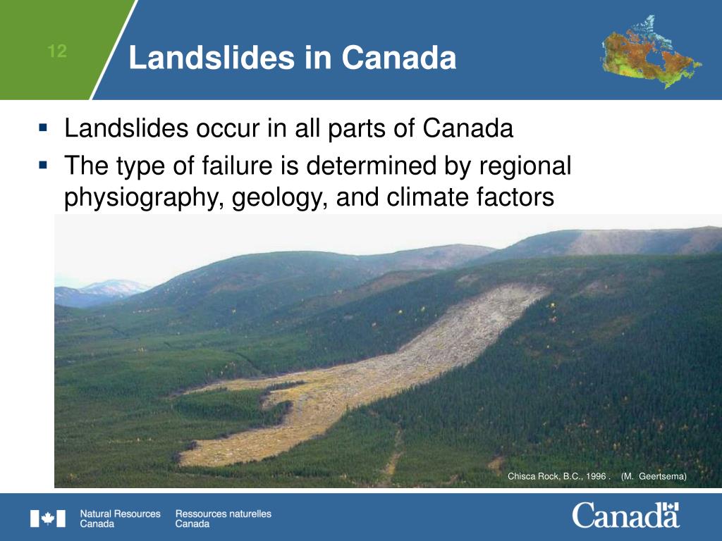 Chisca Rock, B.C., 1996 . (M. Geertsema) Landslides in Canada • Landslides occur in all parts of Canada • The type of failure is determined by regional physiography, geology, and climate factors