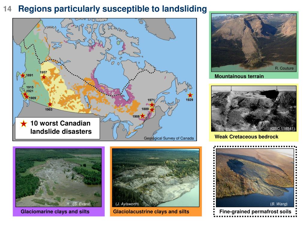 R. Couture Mountainous terrain Fine-grained permafrost soils 10 worst Canadian landslide disasters (GSC 118541) Weak Cretaceous bedrock Geological Survey of Canada (J. Aylsworth) (S. Evans) (B. Wang) Glaciolacustrine clays and silts Glaciomarine clays and silts 14 Regions particularly susceptible to landsliding