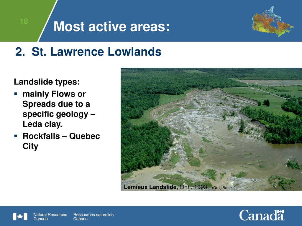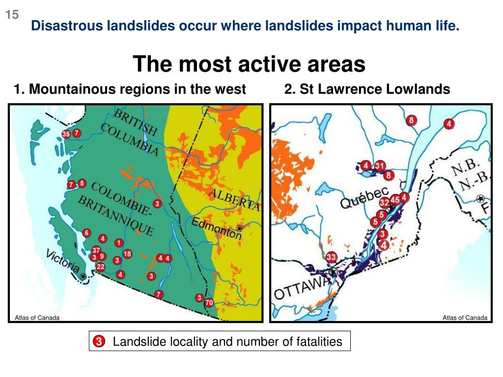 Atlas of Canada Atlas of Canada Landslide locality and number of fatalities 3 15 Disastrous landslides occur where landslides impact human life. The most active areas 1. Mountainous regions in the west 2. St Lawrence Lowlands