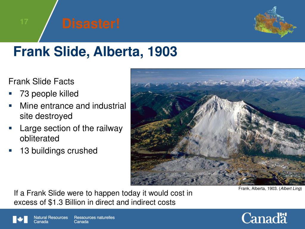 Frank, Alberta, 1903. (Albert Ling) Disaster! Frank Slide, Alberta, 1903 Frank Slide Facts • 73 people killed • Mine entrance and industrial site destroyed • Large section of the railway obliterated • 13 buildings crushed If a Frank Slide were to happen today it would cost in excess of $1.3 Billion in direct and indirect costs