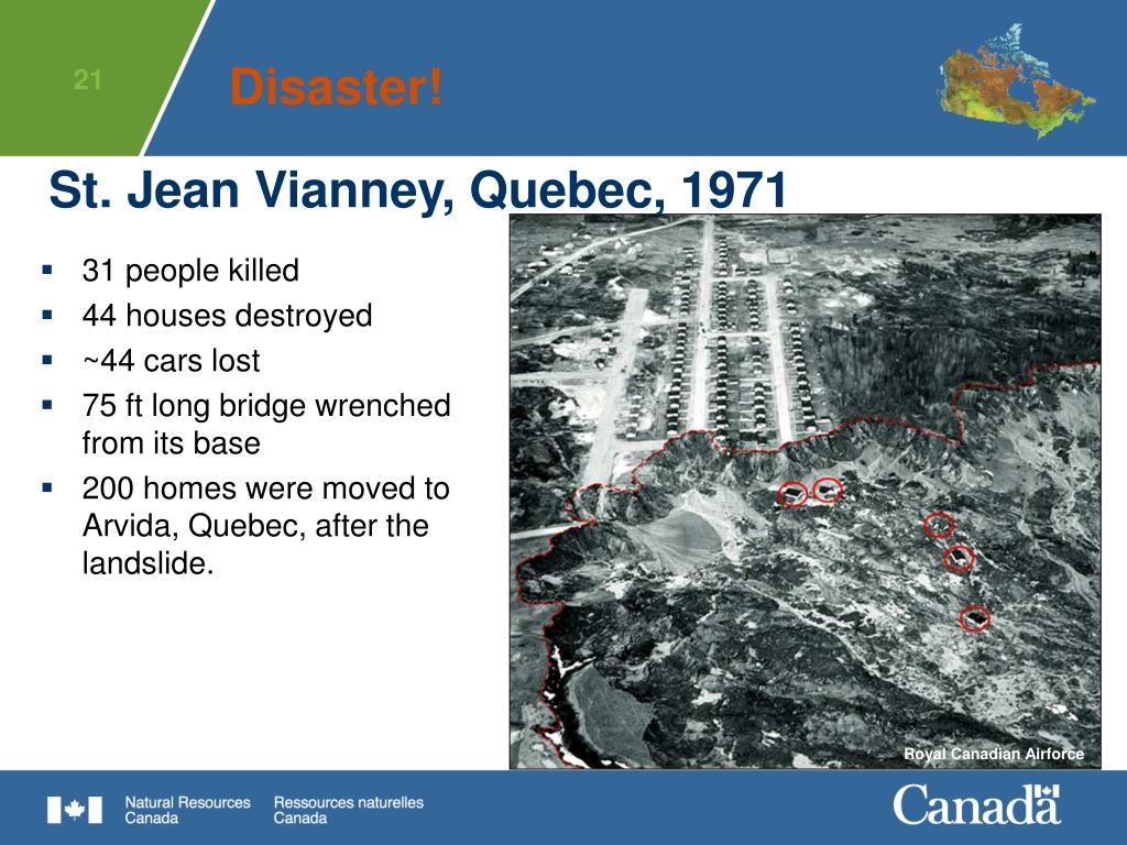 Disaster! St. Jean Vianney, Quebec, 1971 • 31 people killed • 44 houses destroyed • ~44 cars lost • 75 ft long bridge wrenched from its base • 200 homes were moved to Arvida, Quebec, after the landslide. Royal Canadian Airforce