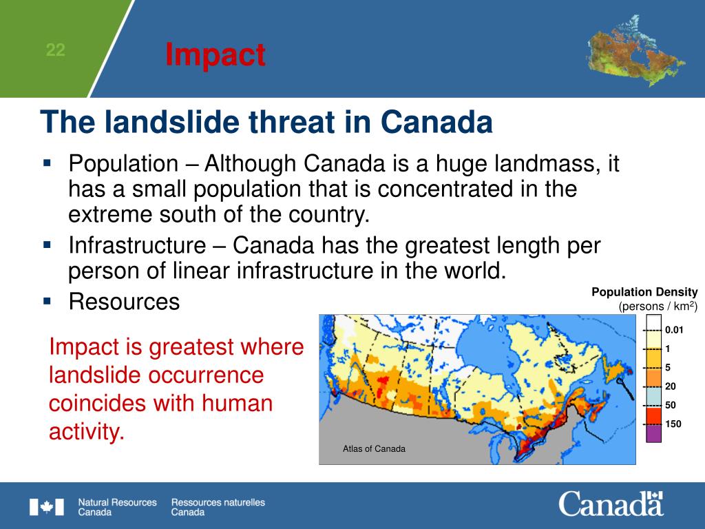 Population Density (persons / km2) ------ 0.01 ------ 1 ------ 5 ------ 20 ------ 50 ------ 150 Atlas of Canada Impact The landslide threat in Canada • Population – Although Canada is a huge landmass, it has a small population that is concentrated in the extreme south of the country. • Infrastructure – Canada has the greatest length per person of linear infrastructure in the world. • Resources Impact is greatest where landslide occurrence coincides with human activity.