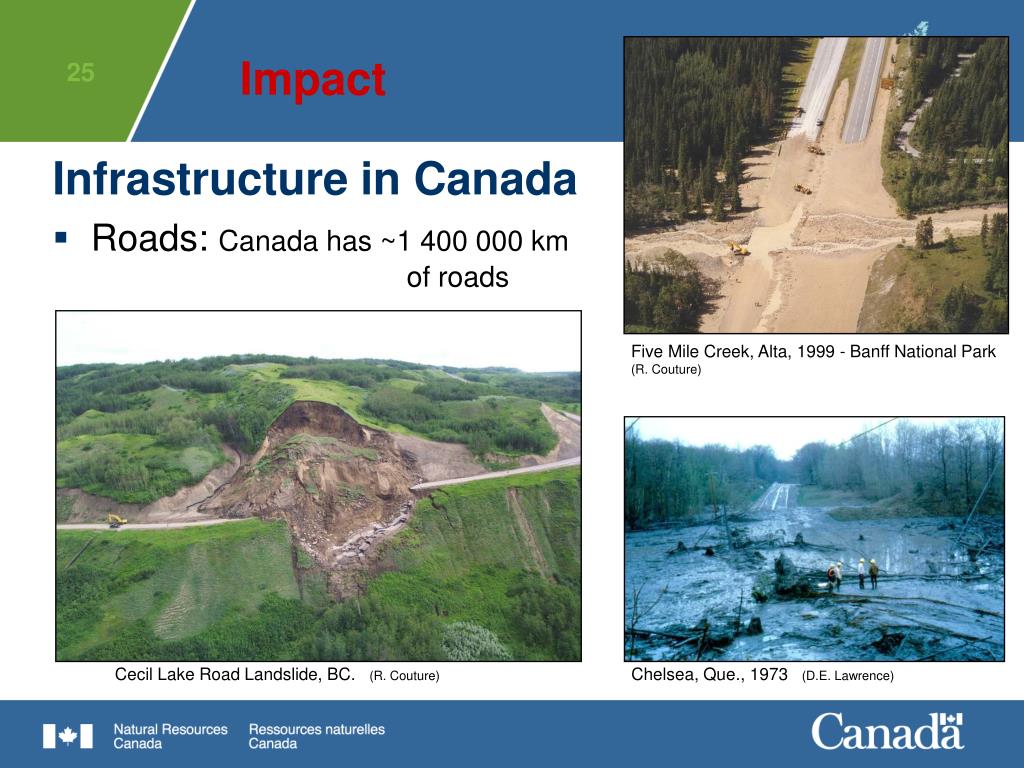 Five Mile Creek, Alta, 1999 - Banff National Park (R. Couture) Cecil Lake Road Landslide, BC. (R. Couture) Chelsea, Que., 1973 (D.E. Lawrence) Impact Infrastructure in Canada • Roads: Canada has ~1 400 000 km of roads