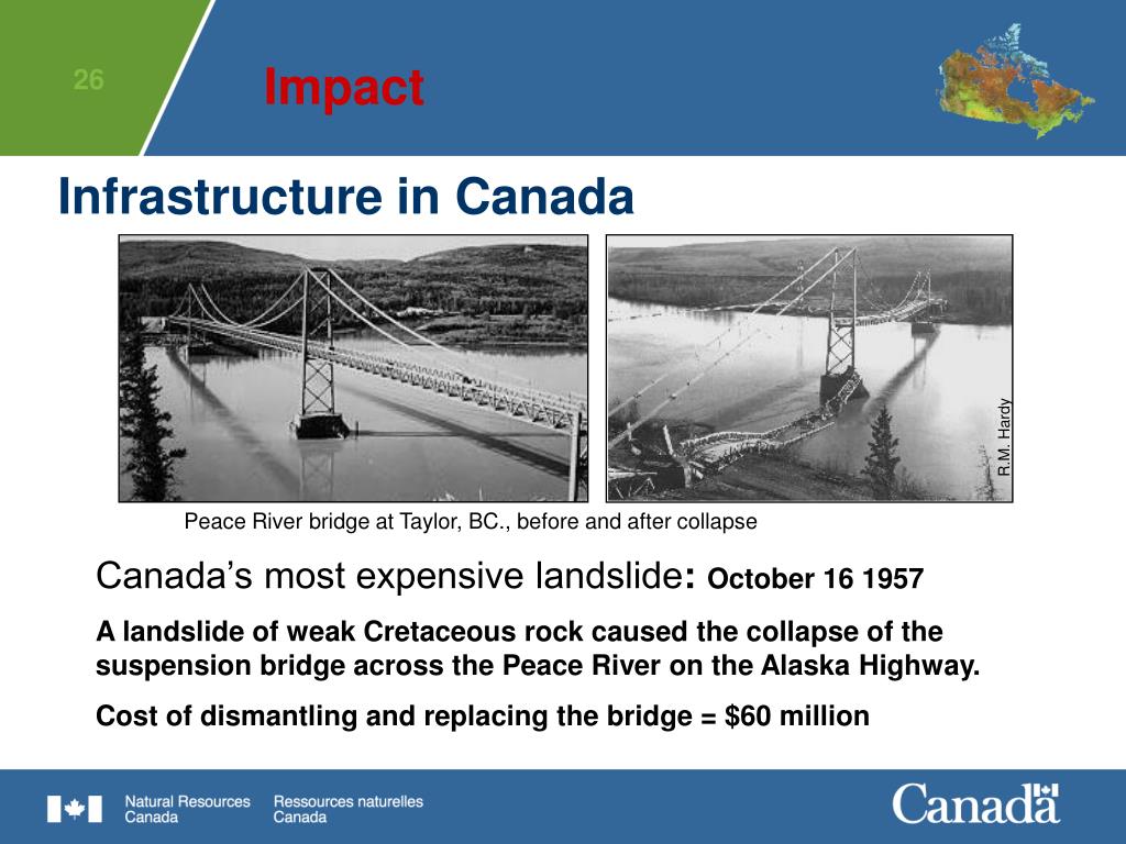 R.M. Hardy Impact Infrastructure in Canada Peace River bridge at Taylor, BC., before and after collapse Canada’s most expensive landslide: October 16 1957 A landslide of weak Cretaceous rock caused the collapse of the suspension bridge across the Peace River on the Alaska Highway. Cost of dismantling and replacing the bridge = $60 million