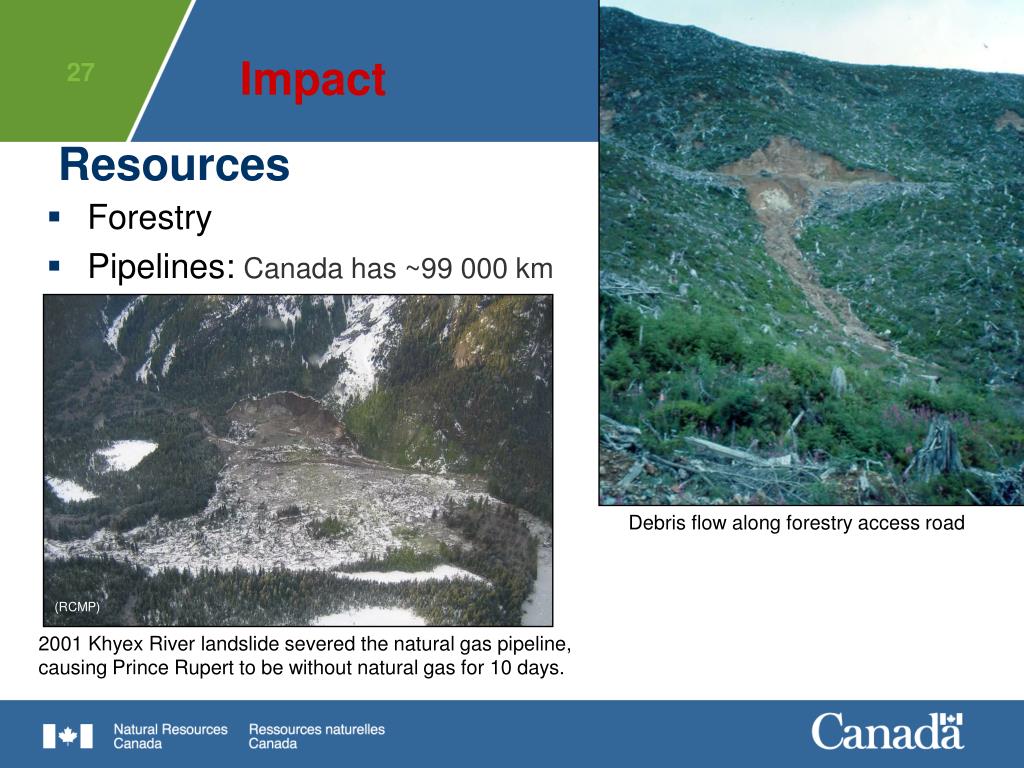 Impact Resources • Forestry • Pipelines:Canada has ~99 000 km Debris flow along forestry access road (RCMP) 2001 Khyex River landslide severed the natural gas pipeline, causing Prince Rupert to be without natural gas for 10 days.