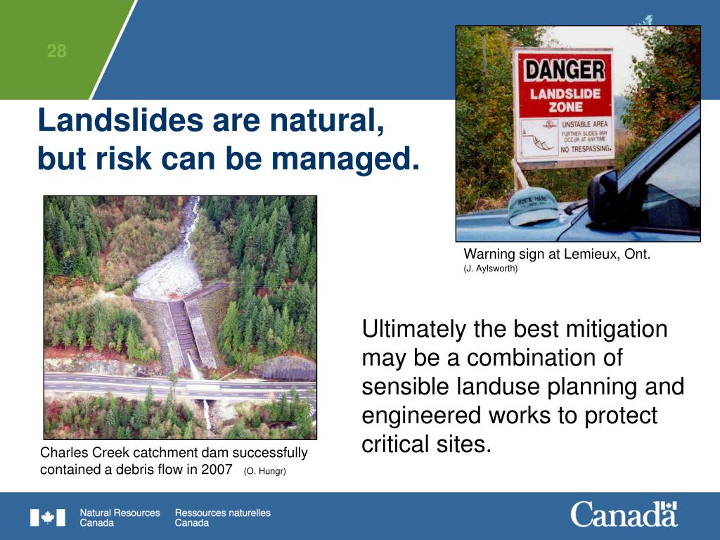 Landslides are natural, but risk can be managed. Warning sign at Lemieux, Ont.(J. Aylsworth) Ultimately the best mitigation may be a combination of sensible landuse planning and engineered works to protect critical sites. Charles Creek catchment dam successfully contained a debris flow in 2007 (O. Hungr)