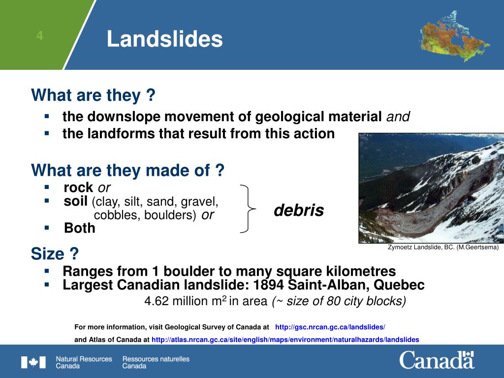 THE LAND IS MOVING! LANDSLIDES IN CANADA. J. M. Aylsworth Geological Survey of Canada Natural Resources Canada. 2. Landslides in Canada. Geological Survey of Canada, photo number GSC 132916 . 3. Contents:. What are Landslides Types of Landslides Landslides in Canada Most active areas