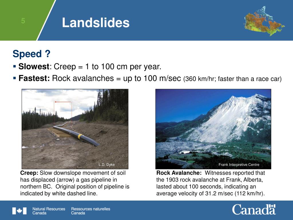 L.D. Dyke Frank Interpretive Centre Landslides Speed ? • Slowest: Creep = 1 to 100 cm per year. • Fastest: Rock avalanches = up to 100 m/sec (360 km/hr; faster than a race car) Creep: Slow downslope movement of soil has displaced (arrow) a gas pipeline in northern BC. Original position of pipeline is indicated by white dashed line. Rock Avalanche: Witnesses reported that the 1903 rock avalanche at Frank, Alberta, lasted about 100 seconds, indicating an average velocity of 31.2 m/sec (112 km/hr).