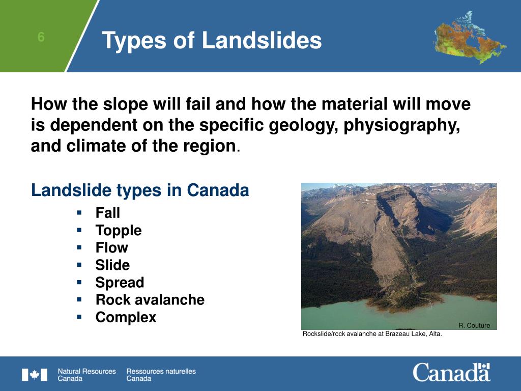 R. Couture Rockslide/rock avalanche at Brazeau Lake, Alta. Types of Landslides How the slope will fail and how the material will move is dependent on the specific geology, physiography, and climate of the region. Landslide types in Canada • Fall • Topple • Flow • Slide • Spread • Rock avalanche • Complex