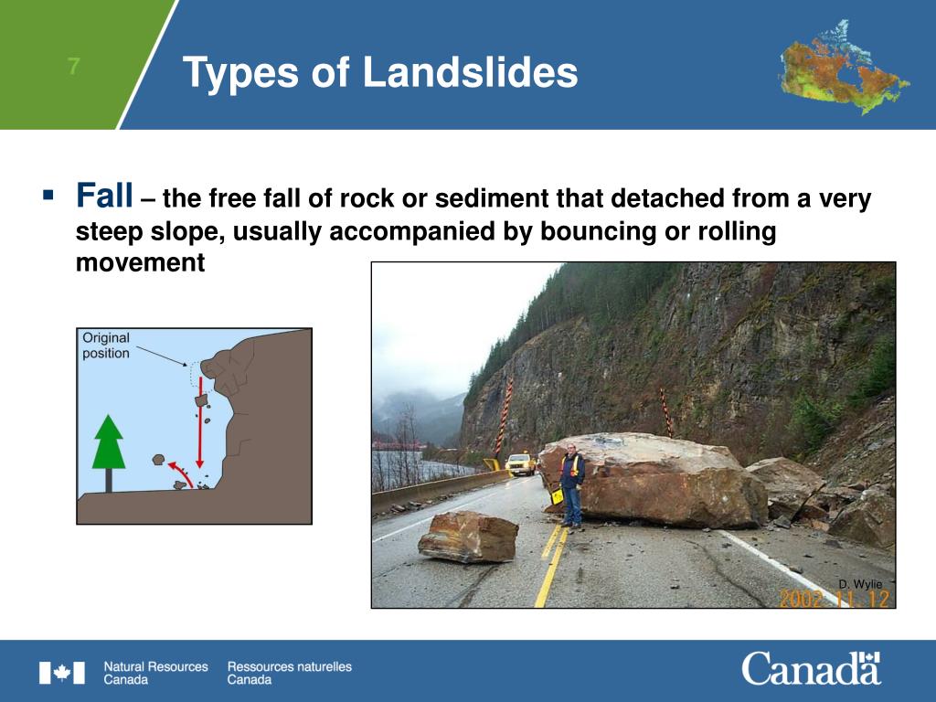 D. Wylie Types of Landslides • Fall – the free fall of rock or sediment that detached from a very steep slope, usually accompanied by bouncing or rolling movement