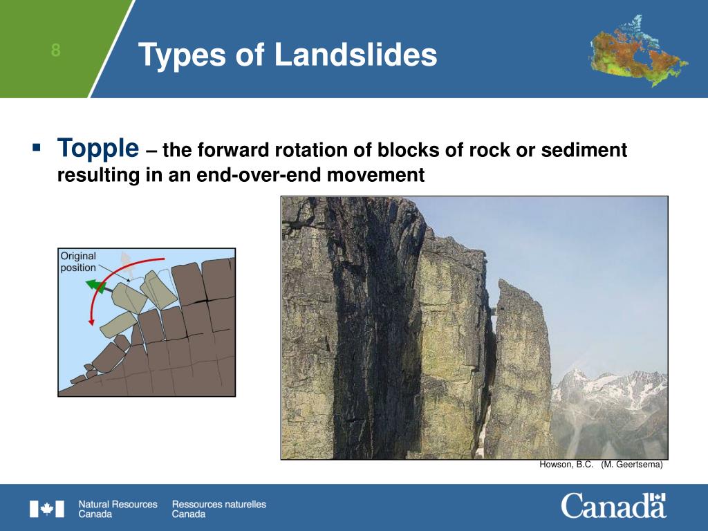 Howson, B.C. (M. Geertsema) Types of Landslides • Topple– the forward rotation of blocks of rock or sediment resulting in an end-over-end movement