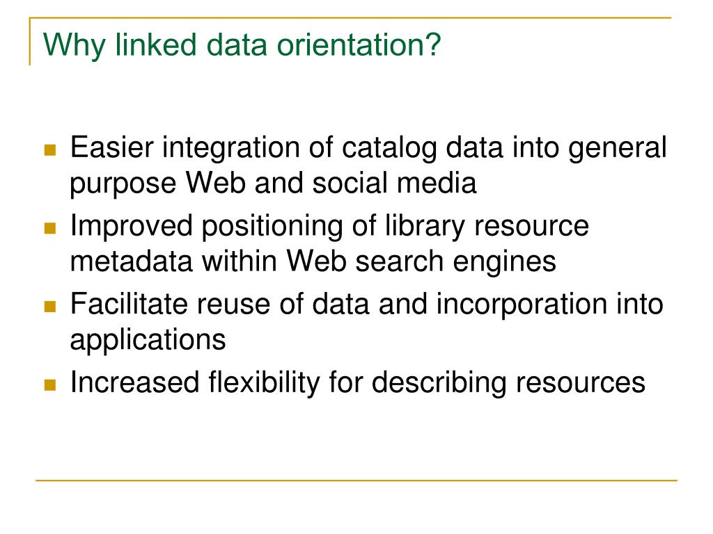 Why linked data orientation? • Easier integration of catalog data into general purpose Web and social media • Improved positioning of library resource metadata within Web search engines • Facilitate reuse of data and incorporation into applications • Increased flexibility for describing resources