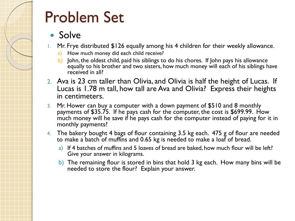 Problem Set • Solve • Mr. Frye distributed $126 equally among his 4 children for their weekly allowance. • How much money did each child receive? • John, the oldest child, paid his siblings to do his chores. If John pays his allowance equally to his brother and two sisters, how much money will each of his siblings have received in all? • Ava is 23 cm taller than Olivia, and Olivia is half the height of Lucas. If Lucas is 1.78 m tall, how tall are Ava and Olivia? Express their heights in centimeters. • Mr. Hower can buy a computer with a down payment of $510 and 8 monthly payments of $35.75. If he pays cash for the computer, the cost is $699.99. How much money will he save if he pays cash for the computer instead of paying for it in monthly payments? • The bakery bought 4 bags of flour containing 3.5 kg each. 475 g of flour are needed to make a batch of muffins and 0.65 kg is needed to make a loaf of bread. • If 4 batches of muffins and 5 loaves of bread are baked, how much flour will be left? Give your answer in kilograms. • The remaining flour is stored in bins that hold 3 kg each. How many bins will be needed to store the flour? Explain your answer.