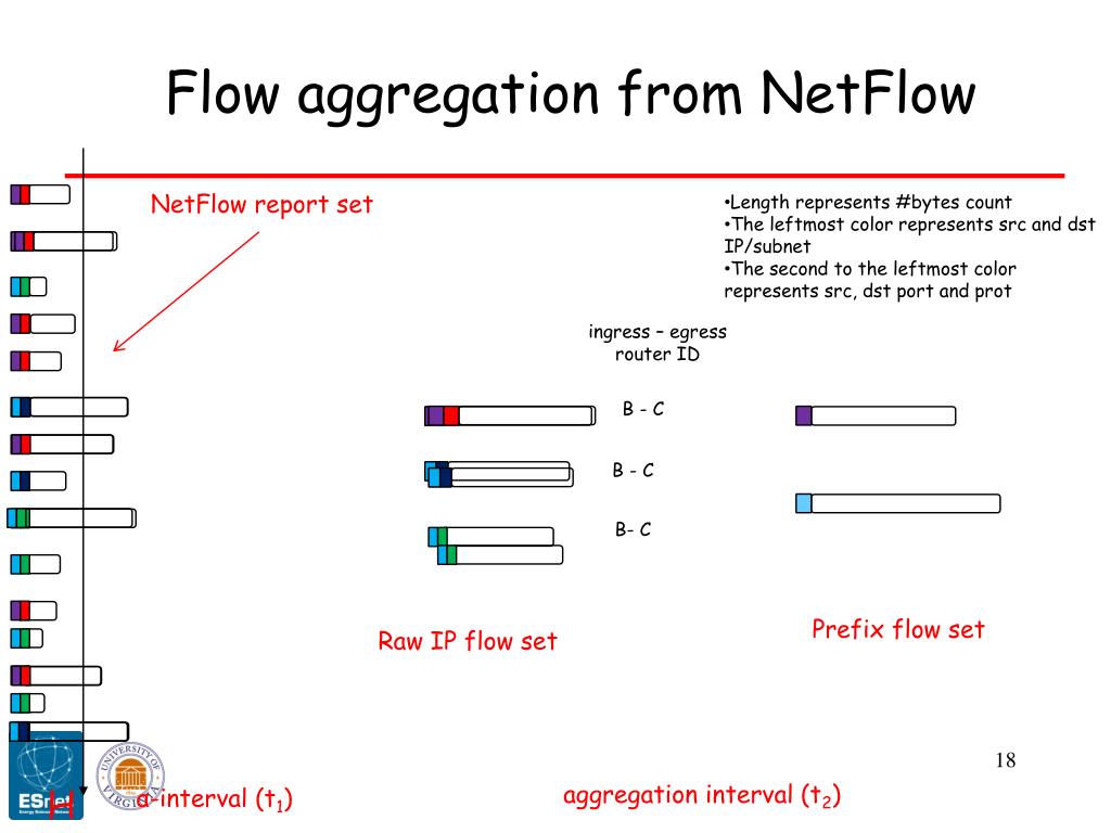 Flow aggregation from NetFlow NetFlow report set • Length represents #bytes count • The leftmost color represents src and dst IP/subnet • The second to the leftmost color represents src, dst port and prot ingress – egress router ID B - C B - C B- C Prefix flow set Raw IP flow set aggregation interval (t2) H α-interval (t1)