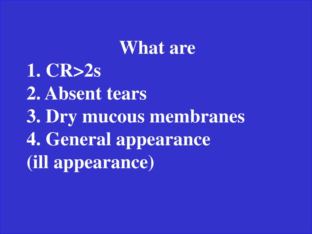 What are 1. CR>2s 2. Absent tears 3. Dry mucous membranes 4. General appearance(ill appearance)