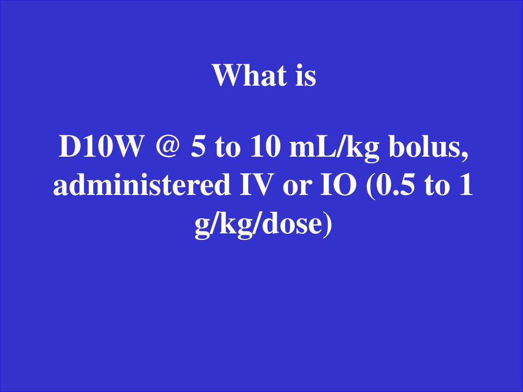 What is D10W @ 5 to 10 mL/kg bolus, administered IV or IO (0.5 to 1 g/kg/dose)