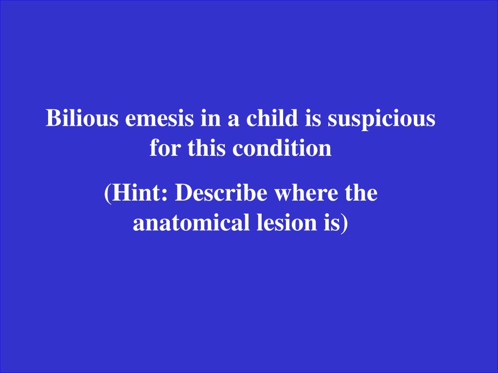 Bilious emesis in a child is suspicious for this condition (Hint: Describe where the anatomical lesion is)