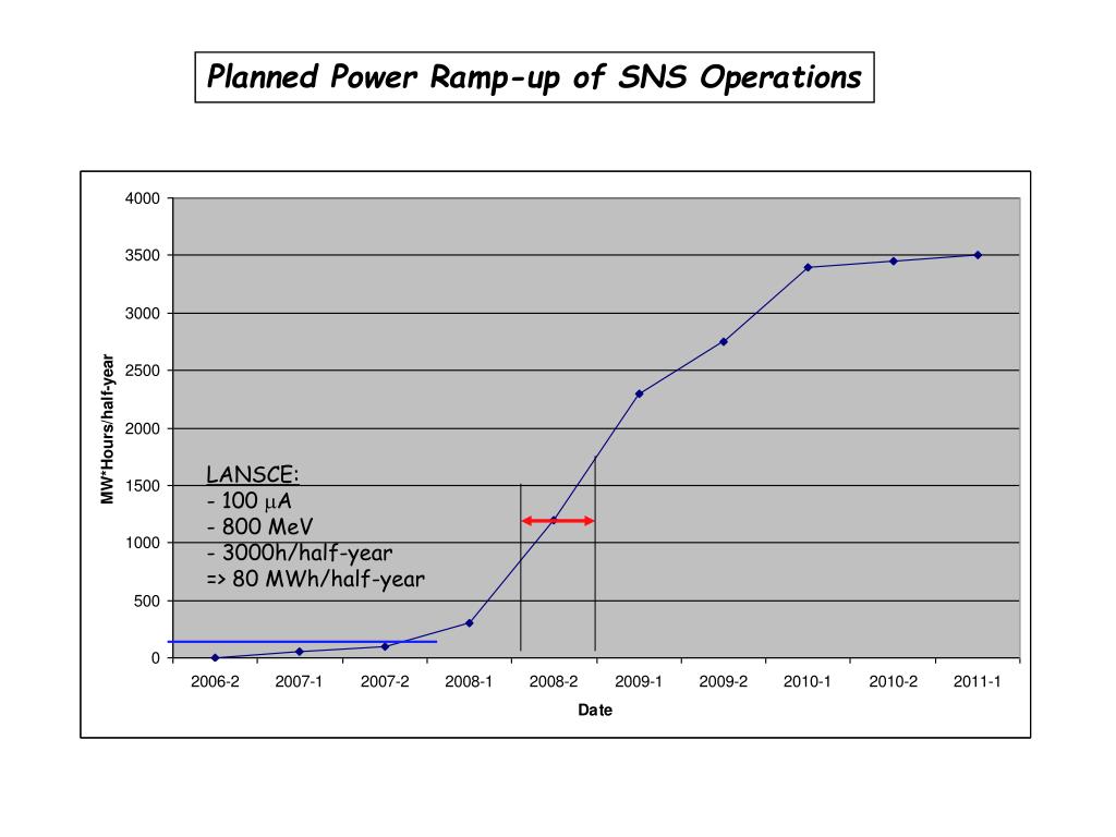 Planned Power Ramp-up of SNS Operations LANSCE: - 100 A - 800 MeV - 3000h/half-year => 80 MWh/half-year