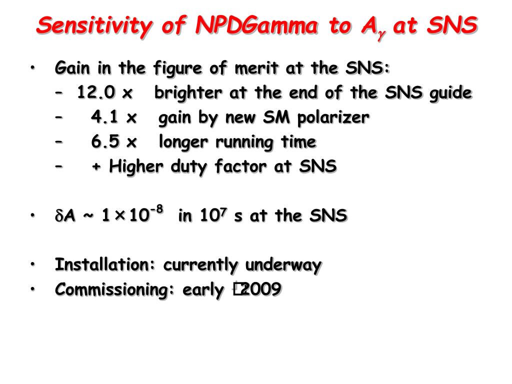 Sensitivity of NPDGamma to A at SNS • Gain in the figure of merit at the SNS: • 12.0 x brighter at the end of the SNS guide • 4.1 x gain by new SM polarizer • 6.5 x longer running time • + Higher duty factor at SNS • A ~ 1×10-8 in 107 s at the SNS • Installation: currently underway • Commissioning: early 2009