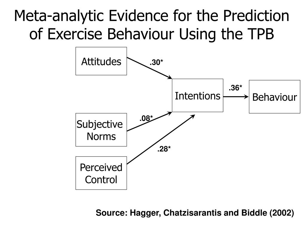 Meta-analytic Evidence for the Prediction of Exercise Behaviour Using the TPB Attitudes .30* Intentions Behaviour .36* .08* Subjective Norms .28* Perceived Control Source: Hagger, Chatzisarantis and Biddle (2002)
