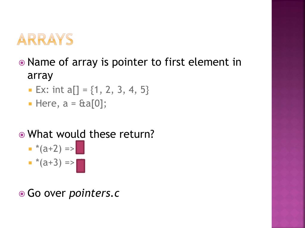 Arrays • Name of array is pointer to first element in array • Ex: int a[] = {1, 2, 3, 4, 5} • Here, a = &a[0]; • What would these return? • *(a+2) => 3 • *(a+3) => 4 • Go over pointers.c
