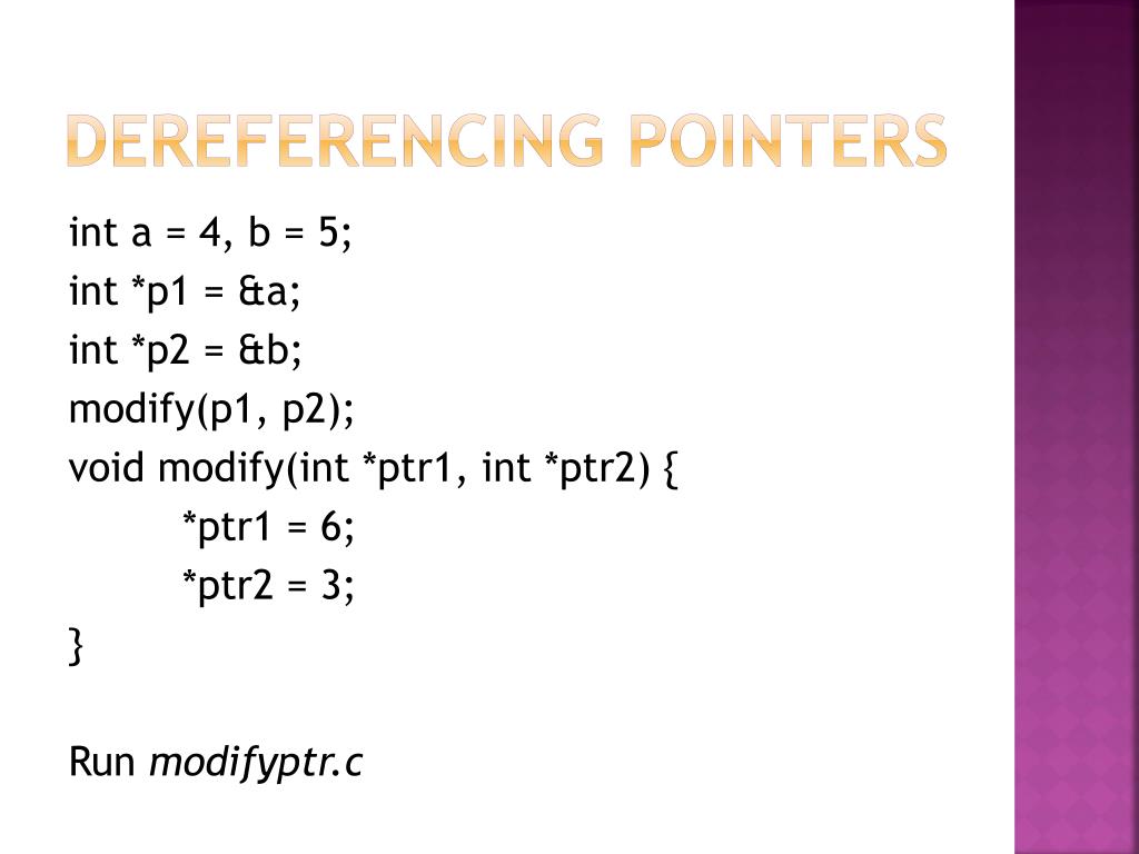 Dereferencing Pointers int a = 4, b = 5; int *p1 = &a; int *p2 = &b; modify(p1, p2); void modify(int *ptr1, int *ptr2) { *ptr1 = 6; *ptr2 = 3; } Run modifyptr.c