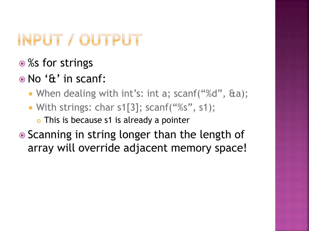 Input / Output • %s for strings • No ‘&’ in scanf: • When dealing with int’s: int a; scanf(“%d”, &a); • With strings: char s1[3]; scanf(“%s”, s1); • This is because s1 is already a pointer • Scanning in string longer than the length of array will override adjacent memory space!