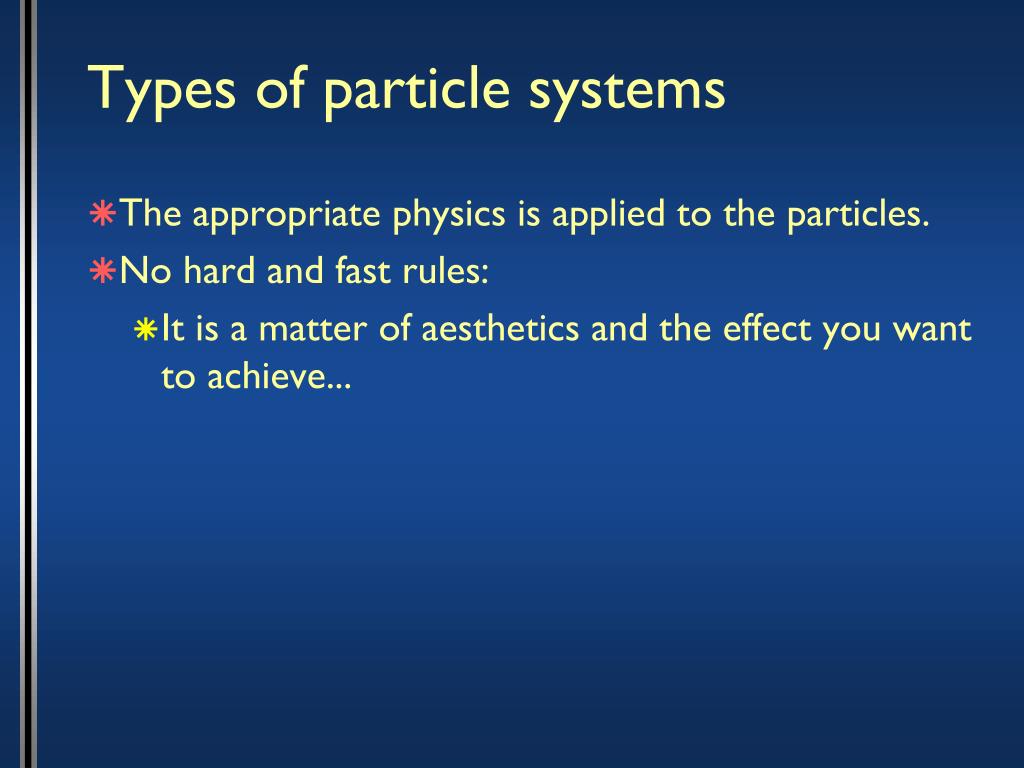 Types of particle systems • The appropriate physics is applied to the particles. • No hard and fast rules: • It is a matter of aesthetics and the effect you want to achieve...