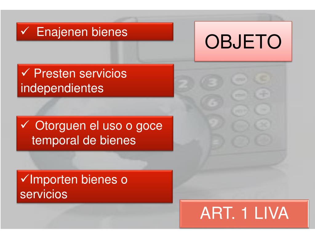 ART. 1 LIVA OBJETO • Enajenen bienes • Otorguen el uso o goce temporal de bienes • Presten servicios independientes • Importen bienes o servicios