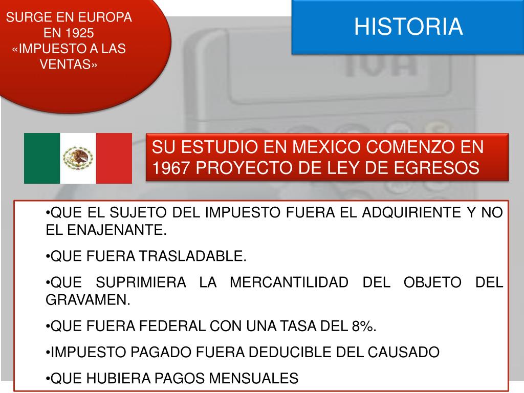 SURGE EN EUROPA EN 1925 «IMPUESTO A LAS VENTAS» HISTORIA SU ESTUDIO EN MEXICO COMENZO EN 1967 PROYECTO DE LEY DE EGRESOS • QUE EL SUJETO DEL IMPUESTO FUERA EL ADQUIRIENTE Y NO EL ENAJENANTE. • QUE FUERA TRASLADABLE. • QUE SUPRIMIERA LA MERCANTILIDAD DEL OBJETO DEL GRAVAMEN. • QUE FUERA FEDERAL CON UNA TASA DEL 8%. • IMPUESTO PAGADO FUERA DEDUCIBLE DEL CAUSADO • QUE HUBIERA PAGOS MENSUALES